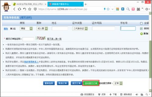 圖5:360極速瀏覽器“火車票刷票機(jī)”自動(dòng)提交訂單