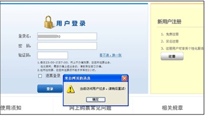 是不是一次次嘗試登錄12306官網(wǎng)都被無(wú)情地拒之門外了?一遍遍輸入賬號(hào)、密碼、驗(yàn)證碼手都快發(fā)麻了?小編也遇到過(guò)類似情況,下圖是小編登錄失敗是的截圖,系統(tǒng)彈窗顯示當(dāng)前訪問用戶太多,請(qǐng)稍后再試。