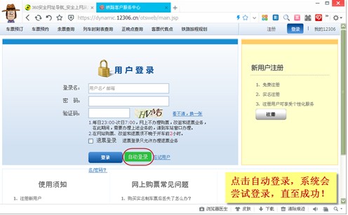 相信大家心里都清楚,稍后再試票就被搶空了,需要抓住每一次可成功登錄的縫隙。360極速瀏覽器“火車票刷票機(jī)”就有這樣的功能,用戶點(diǎn)擊進(jìn)入登錄頁(yè)面,輸入登錄信息后,點(diǎn)擊綠色的“自動(dòng)登錄”按鈕,剩下的就是等著慶祝成功“搶灘”12306官網(wǎng)了。