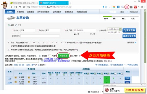 成功登錄賬戶只是搶票的開始,對(duì)于一些熱門線路來(lái)說(shuō),火車票早已被搶購(gòu)一空。這時(shí)使用360極速瀏覽器“火車票刷票機(jī)”自動(dòng)刷票功能就能把握住每一張退票、訂票失敗等回流的車票。刷票過(guò)程中,只要保留刷票頁(yè)面,一旦發(fā)現(xiàn)火車票,即刻彈窗提醒用戶搶購(gòu)。