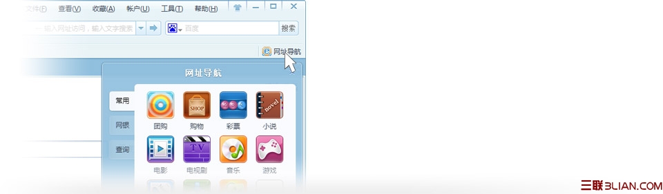 直接使用“網(wǎng)址導航”內(nèi)的類別就可去搜尋信息及網(wǎng)址,方便 快捷;提供了一些常用類別、網(wǎng)銀及實用查詢供用戶選擇。