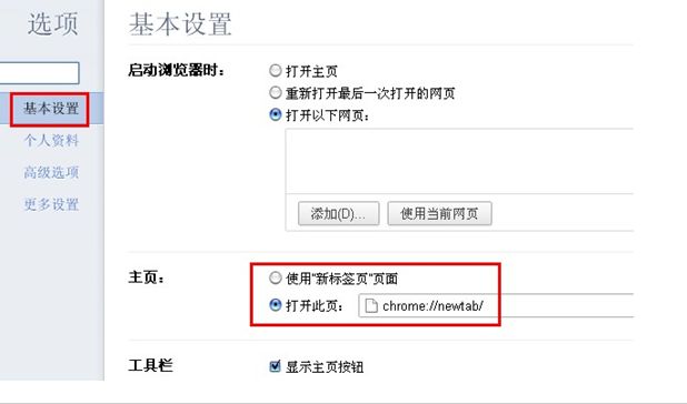 二、在“基本設置”的“在啟動頁上”和“主頁”兩個選項進行設置即可,在圖示界面即可根據提示,修改您的瀏覽器首頁,如圖所示。