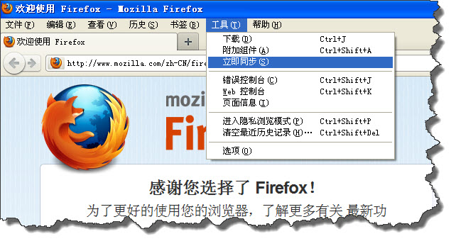 以下步驟注冊用戶,設置同步選項。單擊Firefox瀏覽器“工具”下的“設置同步”命令按鈕。