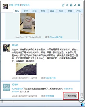 當滾動條滾動過一頁內容之后,頁面右下角會出現“返回頂部”按鈕,用戶可以一鍵快速返回頂部,瀏覽最新微博。