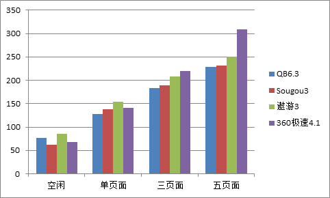 而在空閑情況下,搜狗瀏覽器的內存釋放最徹底、360極速瀏覽器次之、接著是QQ瀏覽器,最后墊底的還是傲游瀏覽器。