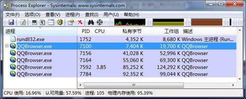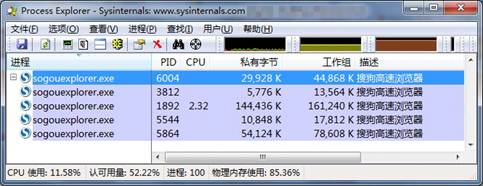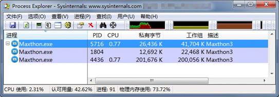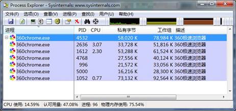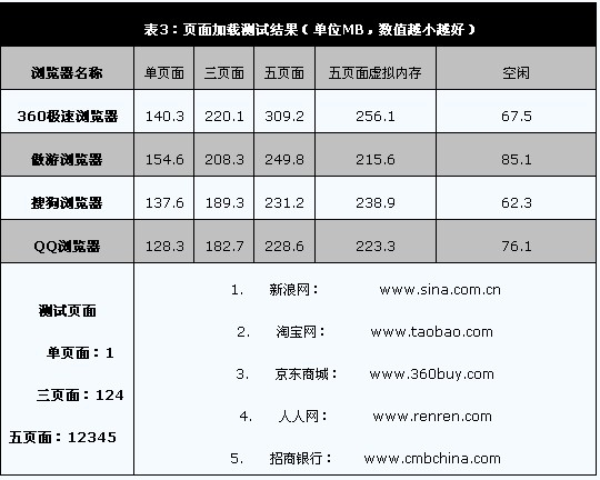 我們分別以單頁面、三頁面、五頁面,五頁面虛擬內存、空閑五項作為測試項目,選擇5個最常用的網站為測試頁面,瀏覽時均使用瀏覽器默認的配置以及建議使用的核心,待全部頁面加在完畢后,使用Process Explorer記錄內存占用。然后關閉所有頁面,再次記錄空閑時的內存占用情況。