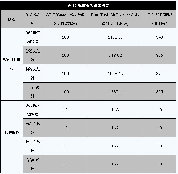 Web標準兼容測試分為IE9核心和Webkit核心兩類,分別測試對ACID3、DOM、HTML5的兼容性。