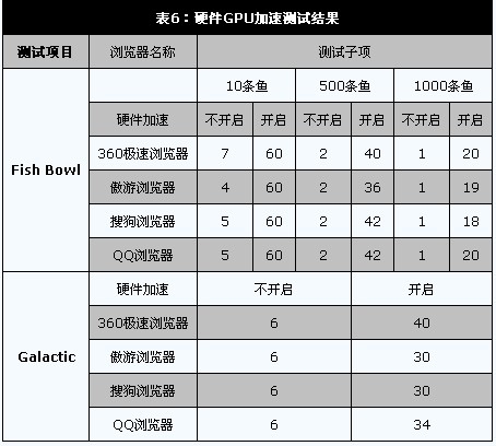 從測試結果可以看出,硬件GPU加速的效果非常明顯,能夠大幅提高測試的成績。而不同瀏覽器的優化也不經相同,依然是360極速瀏覽器和QQ瀏覽器的成績分居一二位。