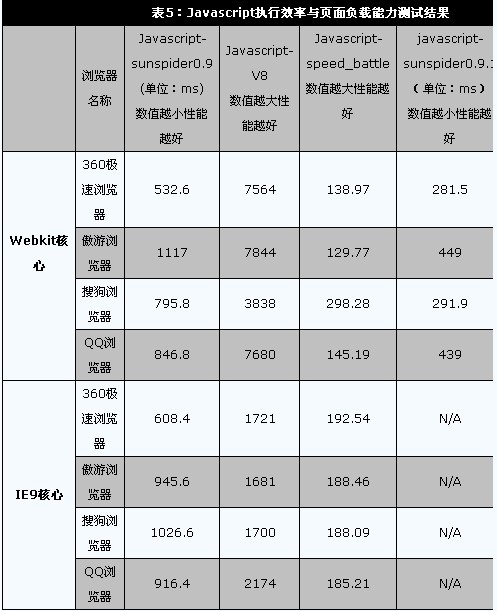 Javascript執行效率與頁面負載能力測試的目的主要是考察Javascript引擎、腳本執行效率的CPU占用率,表現為頁面打開后的流暢度。從結果上可以看出,Webkit確實是一個非常優秀的核心,其整體成績均高于IE9核心,在PeaceKeeper子項測試中,差距甚至達到了3倍。整體來看,360瀏覽器、搜狗瀏覽器,QQ瀏覽器的差距較小、而傲游瀏覽器的表現則更糟,在幾項測試中居大幅落后于前三者。