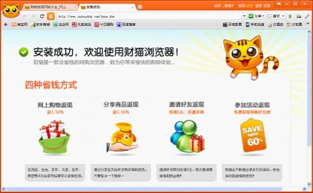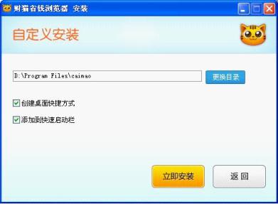 財貓省錢瀏覽器的安裝過程比較簡單,運行安裝程序,可以選擇快速安裝,這種方法比較快捷,無需選擇安裝目錄和安裝選項;選擇自定義安裝時,用戶可以自己選 擇安裝目錄,創建桌面快捷方式、添加快速啟動欄等方便今后操作,較為人性化,整個安裝過程沒有捆綁任何工具及第三方插件。