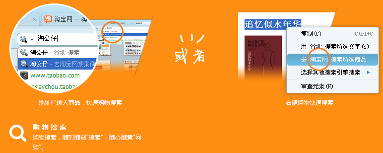 淘寶隨時搜,并支持自定義切換國內常用搜索引擎。