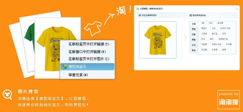 當您在瀏覽網站時,發現喜歡的衣服、褲子、鞋子,右鍵選擇“搜圖淘寶貝”,以圖搜圖,快速幫你找到相似寶貝,購物更輕松。