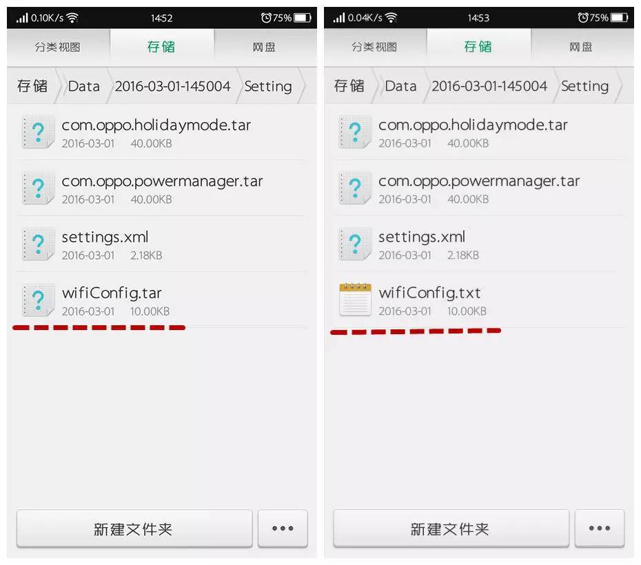 然后到「文件管理」-「存儲」-「Backup」-「Data」中找到剛剛備份的文件夾,在進入「Setting」文件夾,可以看到一個「wifiConfig.tar」的文件,將其后綴名改為.txt。