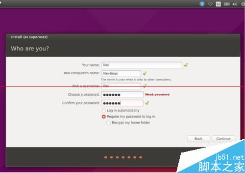 9、進入用戶配置。設置用戶名和密碼。點擊Continue。