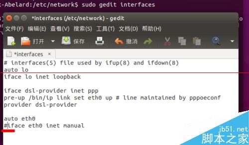4、然后鍵入命令:sudo gedit interfaces,意思是調用 gedit 文本編輯器,并打開 interfaces 這個文件。