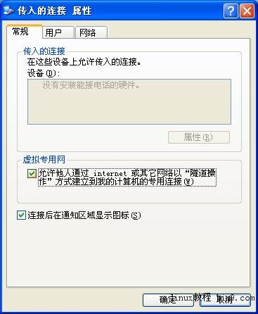 在“傳入的連接 屬性”的“常規”選項卡中,選中“允許他人通過 Internet 或其它網絡以“隧道操作”方式建立到我的計算機的專用鏈接(W)”前面的復選框,如圖所示: