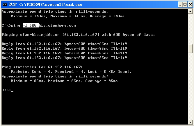 現在以發送一個600字節的數據包為例“ping -l 600 bbs.cfanclub.net"