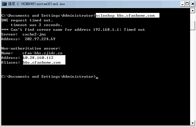 在輸入以下命令“ nolookup bbs.cfanclub.net”就會得到如圖所顯示的結果,主要看下面用白色標記的地方