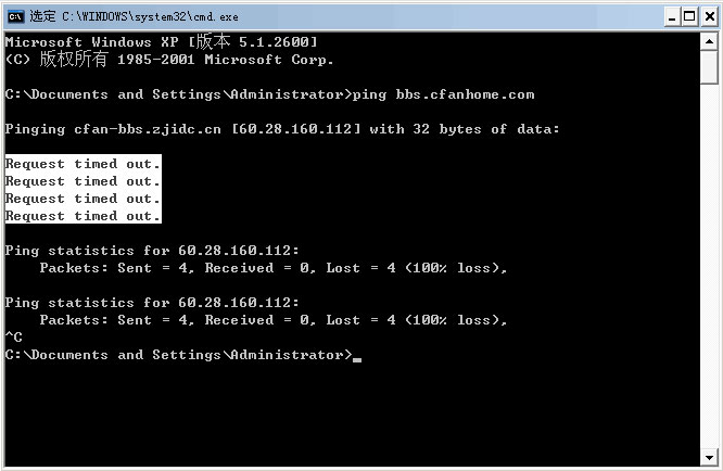 如果你“ping bbs.cfanclub.net”得到如下圖的請求失敗結果。
