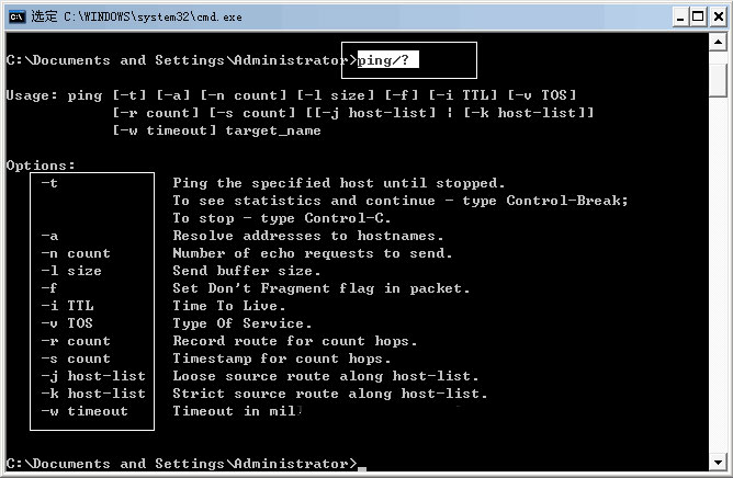 現在來了解一下ping的各個參數命令。輸入如下格式:“ping/?”或直接打上“ping‘也可以