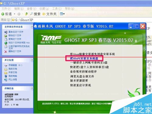 3,就會打開系統映像的安裝界面,我們不安裝系統,只安裝WinPE到硬盤,所以選擇“把WinPE安裝到系統盤”這一項,因為系統版本不同,選項位置與名稱都會有一定不一樣,如果是Ghost版的系統,大多都會有WinPE安裝這一項。