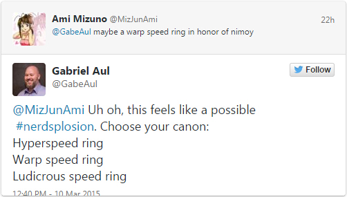 Twitter網友Ami Mizuno在@Gabriel Aul時提到“或許可以來個wrap speed”,然后Gabriel Aul就開玩笑似的回答到可以提供三個選項——Hyperspeed、Warp speed、以及Ludicrous speed。
