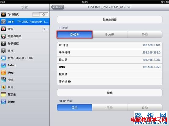 下圖所示為配置DHCP,IPAD無線網(wǎng)絡(luò)連接自動(dòng)獲取IP地址。