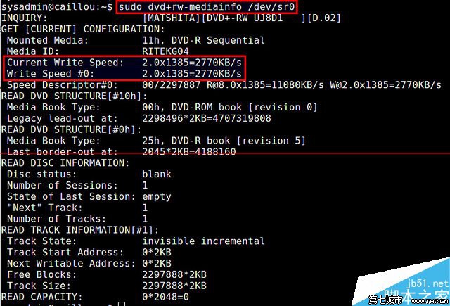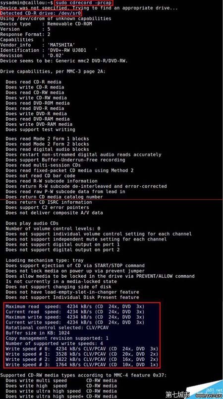 本例中,輸出會告訴你DVD刻錄機(/dev/sr0)與x24的CD刻錄速度(即24x153.6 Kbps)兼容,且相當于x3的DVD寫入速度(即3x1385 KBps的)兼容。這里的寫入速度是最大可能的速度,而實際的寫入速度當然取決于使用的介質(例如:DVD-RW、DVD + RW、DVD-RAM等)。