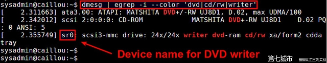 找出與DVD刻錄機相關的設備名稱最簡單的方法是使用dmesg命令行工具,它打印出內核的消息緩沖區。在dmesg的輸出中,尋找一個安裝好的DVD刻錄機: