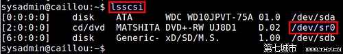 如果成功檢測到,lsscsi命令的輸出會告訴你DVD刻錄機的名稱: