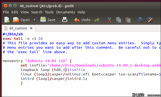 除非你已經(jīng)添加了其它自定義啟動(dòng)條目,否則你應(yīng)當(dāng)看到的是一個(gè)幾乎空的文件。你需要在注釋行下添加一個(gè)或多個(gè)ISO啟動(dòng)部分。