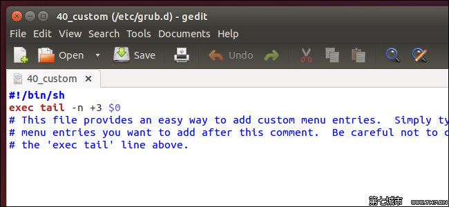 添加自定義啟動(dòng)條目的最簡(jiǎn)單的方式是編輯/etc/grub.d/40_custom腳本,該文件設(shè)計(jì)用于用戶自行添加啟動(dòng)條目。在編輯該文件后,/etc/defaults/grub文件和/etc/grub.d/腳本的內(nèi)容將合成創(chuàng)建/boot/grub/grub.cfg文件——你不應(yīng)該手工編輯這個(gè)文件。它被設(shè)計(jì)為通過(guò)你在另外的文件中指定的設(shè)置自動(dòng)生成。