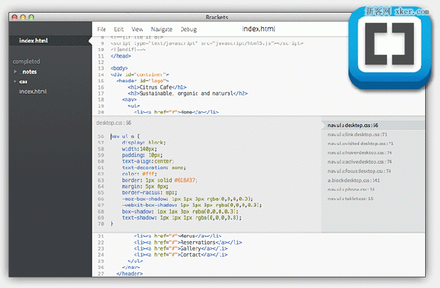 Brackets也是一款為Linux開發者設計的開源代碼編輯器,使用Brackets寫代碼,你不會被任何事情所打斷。比如在寫HTML代碼時,即便你沒有保存代碼也可以及時預覽你的Web頁面效果。你也可以使用Theseus來檢查變量,Brackets默認提供一種主題,當然你也可以在擴展中心獲取更多的主題。