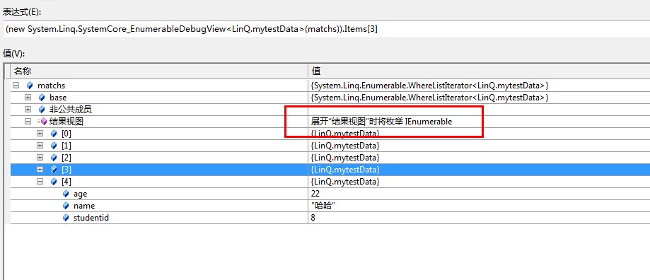 //2、投影--值類型 //注意:這里的IEnumerable<string>中已經將matchs申明為了string類型,說明返回的是string的迭代對象 IEnumerable<string> matchs; matchs = from student in mydata //student是查詢mydata集合中的對象的假名 where student.age > 20 //查詢過濾條件 select student.name + "添加的字符"; //查詢返回滿足過濾條件的matchs的集合 //頁面綁定數據展示 GridView1.DataSource = matchs; GridView1.DataBind();