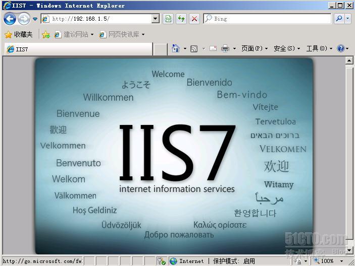 安裝完成后,可以通過【管理工具】中的【Internet信息服務(wù)(IIS)管理器】來管理IIS網(wǎng)站,可以看到其中已經(jīng)建好了一個名為“Default Web Site”的站點(diǎn),在客戶端計算機(jī)client1上打開IE瀏覽器,在地址欄輸入web服務(wù)器的IP地址即可以訪問這個默認(rèn)網(wǎng)站。