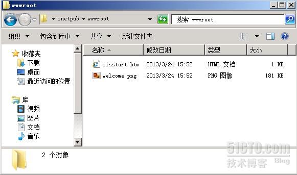 打開這個主目錄,可以看到里面已經(jīng)有一個名為iisstart.htm的網(wǎng)頁文件以及一張圖片,這也就是我們剛才所看到的默認(rèn)網(wǎng)站所顯示的網(wǎng)頁。