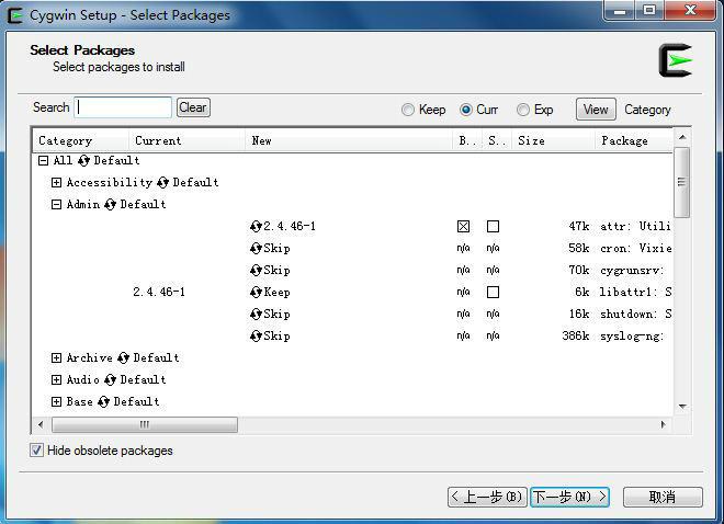這一步很關鍵,選擇要下載和安裝的包,根據你的需要選擇包,選的包越多所需的下載時間越長,單擊【View】可以在分類、全部、已選之間循環切換,點擊每一類前面的加號可以展開,要選中每一個包,只需單擊每一行前邊像循環的那個圖標,會在版本號和Skip之間切換,選一個最新的版本號即可,下邊的那個復選框默認即可:
