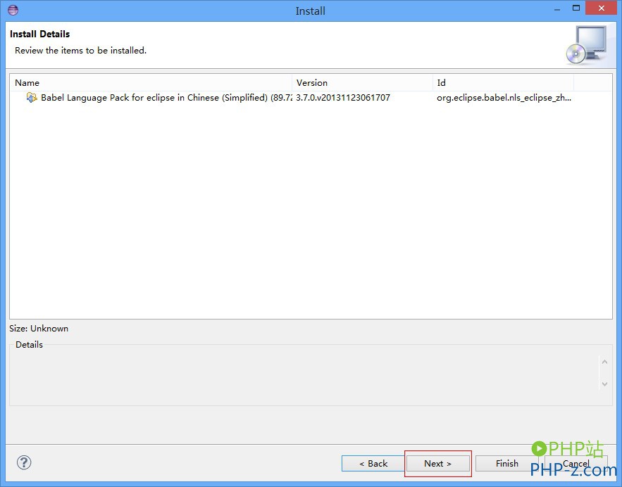 此時看到“Pending...”即正在等待中,用戶等待片刻便會看到軟件檢索到的語言包列表,下拉垂直滾動條,選擇“for eclipse”下的Chinese Simplified(簡體中文)包,點擊“next”按鈕進入下一步。