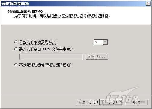 設(shè)置好新磁盤分區(qū)的空間容量后,再單擊“下一步”按鈕,進(jìn)入如圖4所示的向?qū)гO(shè)置窗口;在該設(shè)置窗口中,我們可以選中“分配以下驅(qū)動(dòng)器號(hào)”選項(xiàng),同時(shí)為新磁盤分區(qū)指定一個(gè)沒(méi)有使用過(guò)的磁盤分區(qū)符號(hào),一般來(lái)說(shuō)我們只要使用默認(rèn)分配的磁盤分區(qū)符號(hào)就可以了;如果希望日后再為新磁盤分區(qū)統(tǒng)一分配磁盤分區(qū)符號(hào)時(shí),我們也可以選中這里的“不分配驅(qū)動(dòng)器號(hào)或驅(qū)動(dòng)器路徑”選項(xiàng);