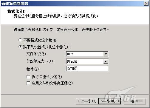 緊接著繼續(xù)單擊“下一步”按鈕,從彈出的如圖5所示的向?qū)гO(shè)置窗口中,選中“按下列設(shè)置格式化這個(gè)設(shè)置”選項(xiàng),之后設(shè)置好文件系統(tǒng)格式以及卷標(biāo)格式,再選中“執(zhí)行快速格式化”選項(xiàng);在確認(rèn)上面的各項(xiàng)信息設(shè)置正確后,再單擊向?qū)гO(shè)置窗口中的“完成”按鈕,那樣一來(lái)在已有分區(qū)中劃分出來(lái)的新分區(qū)就能生效了。