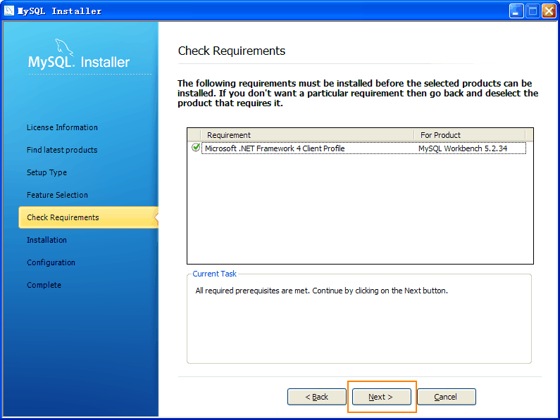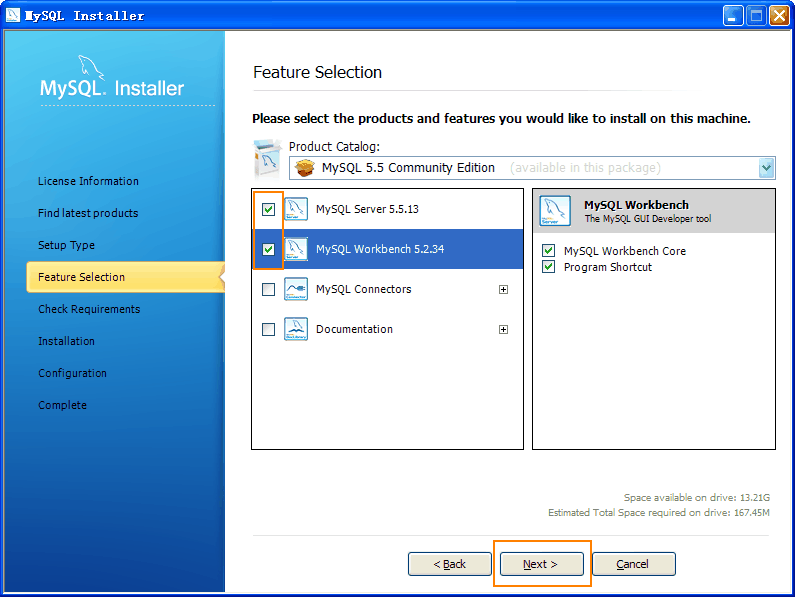 選擇“MySQL Server 5.5.13”與“MySQL Workbench 5.2.34”, “MySQL Workbench 5.2.34”是可視數據庫設計工具。這個工具是設計MySql數據庫的專用工具。也可根據需要選擇是否安裝。選擇“Next”按鈕繼續安裝(如圖 12)。