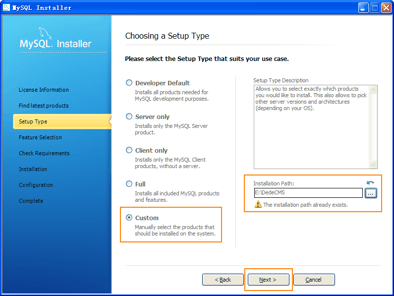 選擇“Custom”,更改安裝路徑為之前創建的目錄。再選擇“Next”繼續安裝(如圖11)。