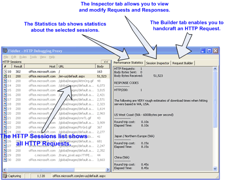 當(dāng)你關(guān)閉Fiddler的時(shí)候,它就會(huì)自動(dòng)從系統(tǒng)注冊(cè)表中移出,換句話說(shuō),當(dāng)你關(guān)閉了Fiddler后,不會(huì)占著茅坑不拉屎。下面,是一個(gè)Fillder的用戶界面,大家可以參考參考其功能。