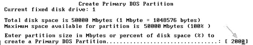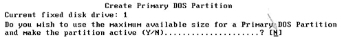 程序提示是否要將整個硬盤的大小都作為主分區,界面如圖5所示。輸入“N”,回車, 然后會出現主分區容量設置界面(如圖6),我們在輸入框中輸入欲分配C盤的容量大小,比如輸入2000(單位MB),回車確認。