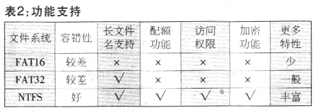 首先我們來看一下表1、2、3,它們從各個方面對NTFS/FAT32/FAT16的基本情況及支持的功能進行了綜合比較。
