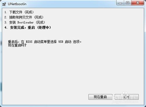 軟件提示要求重啟系統,進入bios設置,然后就能用U盤引導系統了。