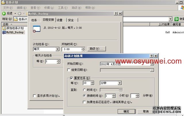 切換到日程安排來選項設置,還可以打開高級來設置每隔幾分鐘運行一次MySQL_Backup.bat這個腳本