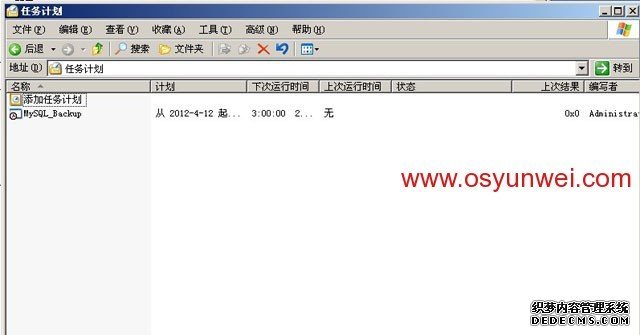 相關說明:d/mysql_data 代表D:mysql_dataMySQL_Backup 代表/etc/rsyncd.conf文件中自定義的模塊名稱comment = MySQL_Backup192.168.21.168 #Rsync服務端IP地址mysqlbakuser #執行數據同步的用戶-vzrtopg --progress #顯示同步過程詳細信息--delete #從cwRsync客戶端D:mysql_data目錄中刪除與Rsync服務端/home/mysql_data目錄中不相同的數據,即保證兩邊的數據完全一致三、在cwRsync客戶端的任務計劃中添加批處理腳本文件,每天凌晨3:00鐘自動同步Rsync服務端/home/mysql_data目錄中的數據到D:mysql_data目錄