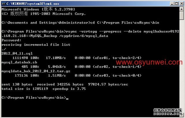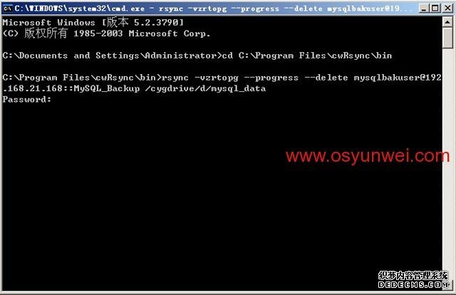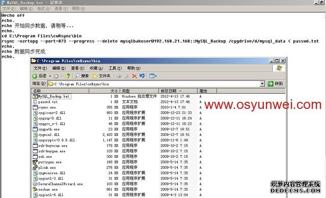 輸入@echo offecho.echo 開始同步數據,請稍等...echo.cd C:Program FilescwRsyncbinrsync -vzrtopg --port=873 --progress --delete mysqlbakuser@192.168.21.168::MySQL_Backup /cygdrive/d/mysql_data < passwd.txtecho.echo 數據同步完成echo.