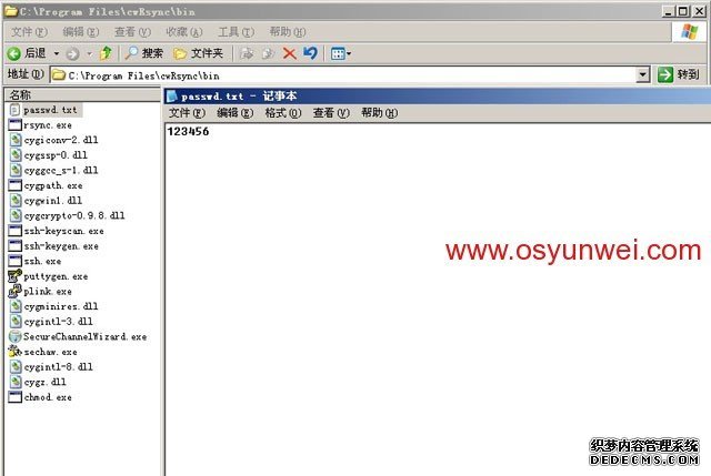 1、打開C:Program FilescwRsyncbin目錄,新建passwd.txt
